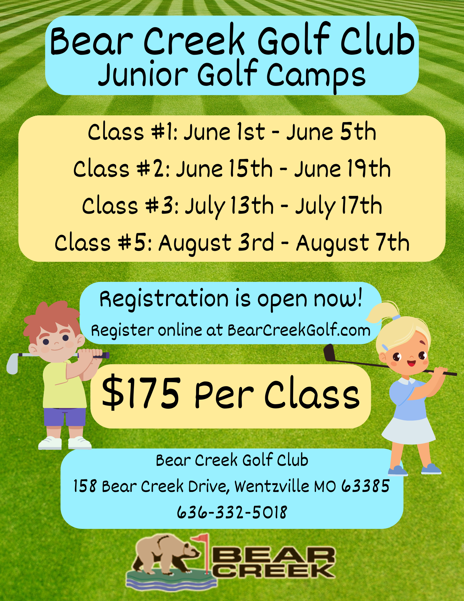 This lesson program is great for juniors 8-16 years old wanting to learn all aspects of the game of golf. Great for beginners or experienced junior golfers wanting to brush up on the fundamentals of their golf swing. This 1-Week Program meets for two and a half hours Monday through Friday at the time scheduled. Classes range in size from 12-15 students and are put together by the Bear Creek Golf Professional, Kirk Porter. Students should meet at the designated location and bring the club listed, or inform the instructor in advance that you need clubs.